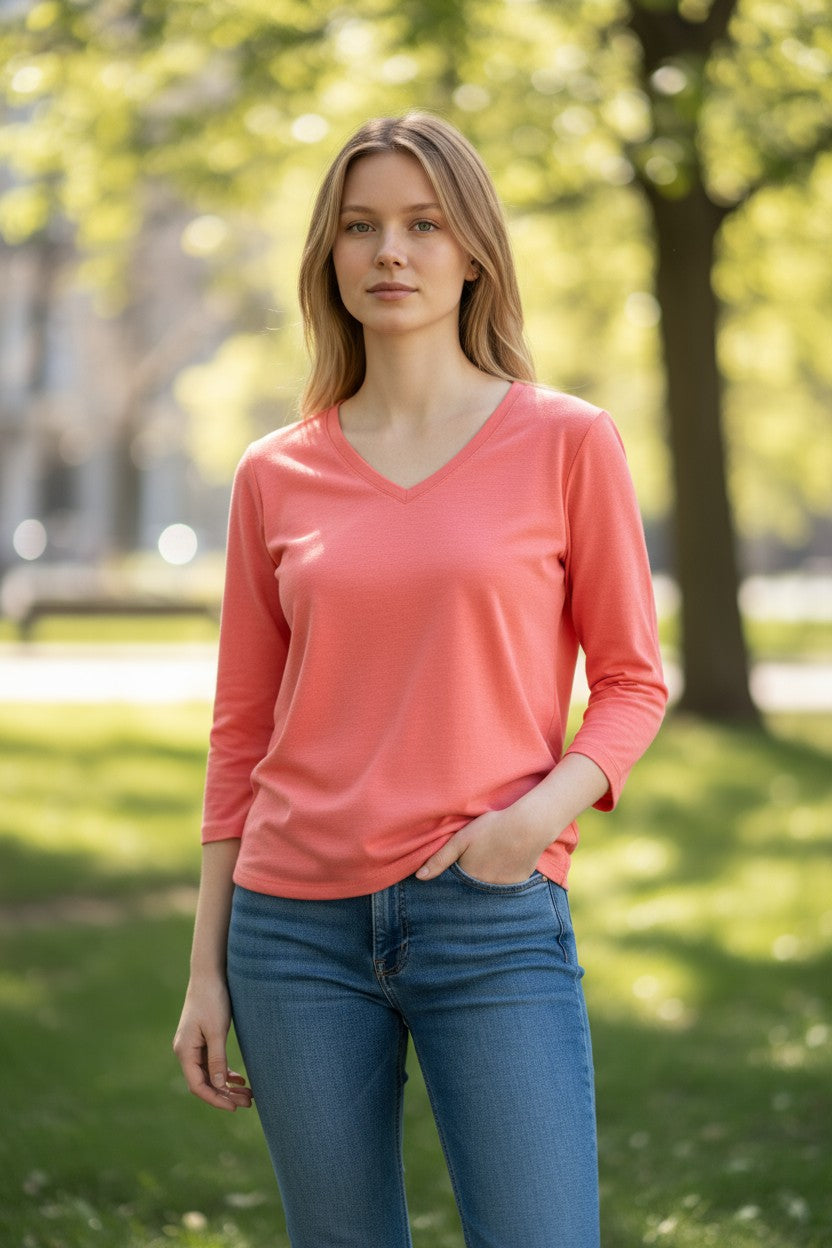 Peach Lady's V-Neck Merino T-shirts 3/4 Sleeve