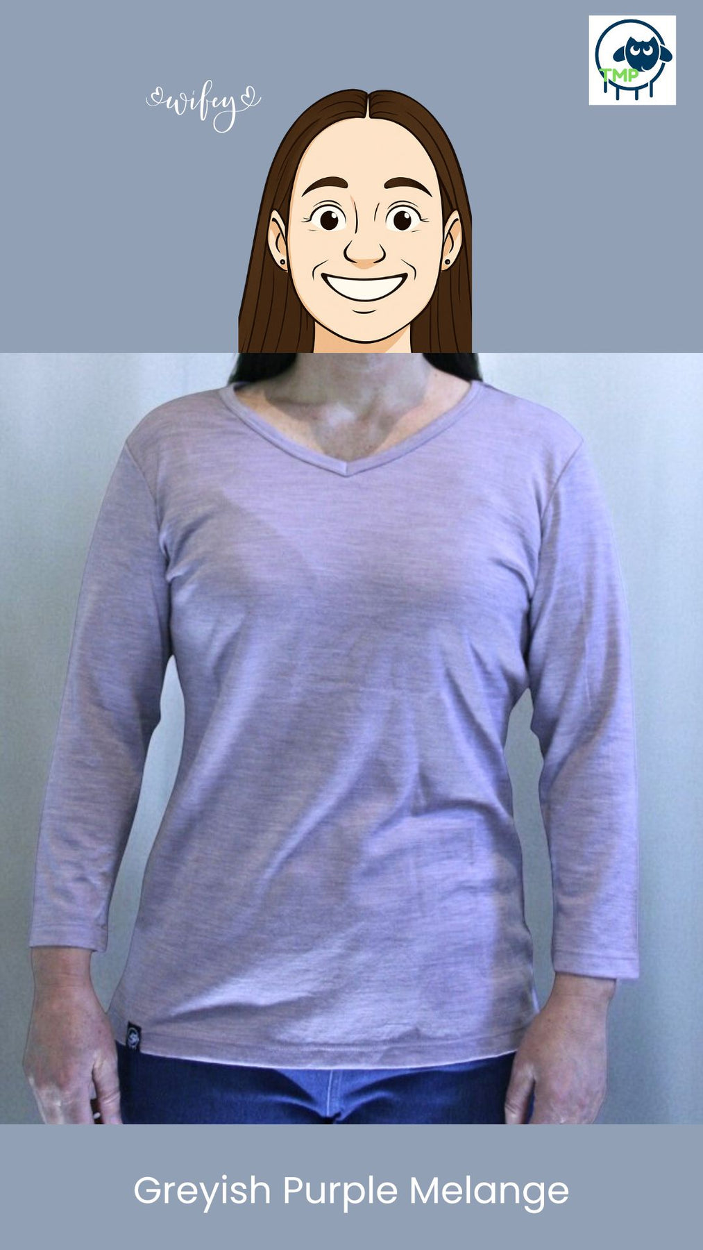 Person wearing a greyish purple melange shirt against a plain background